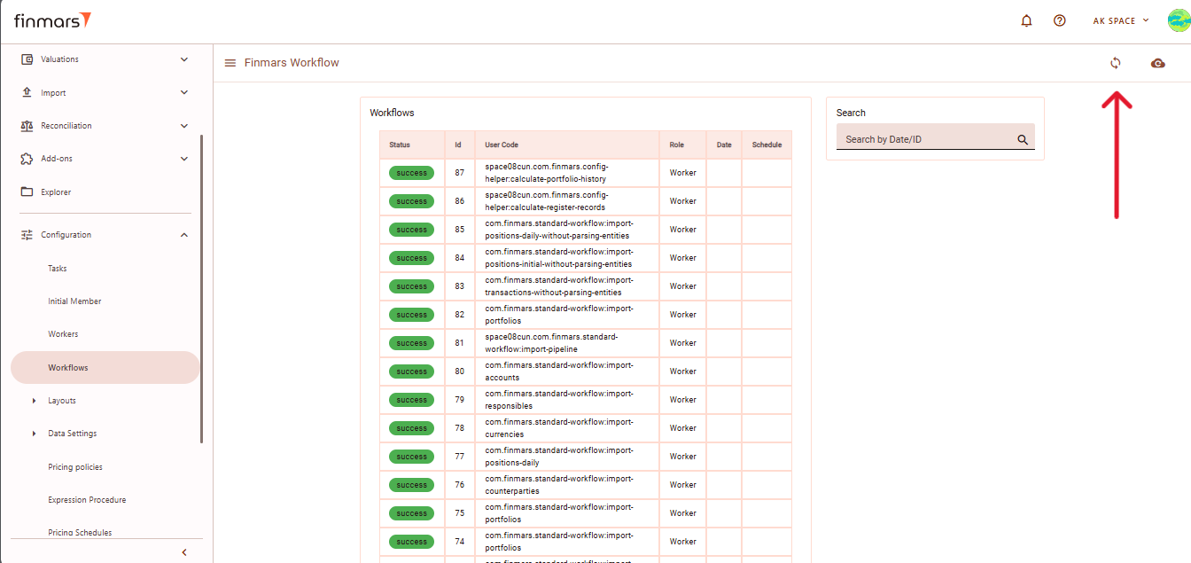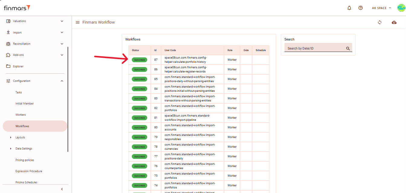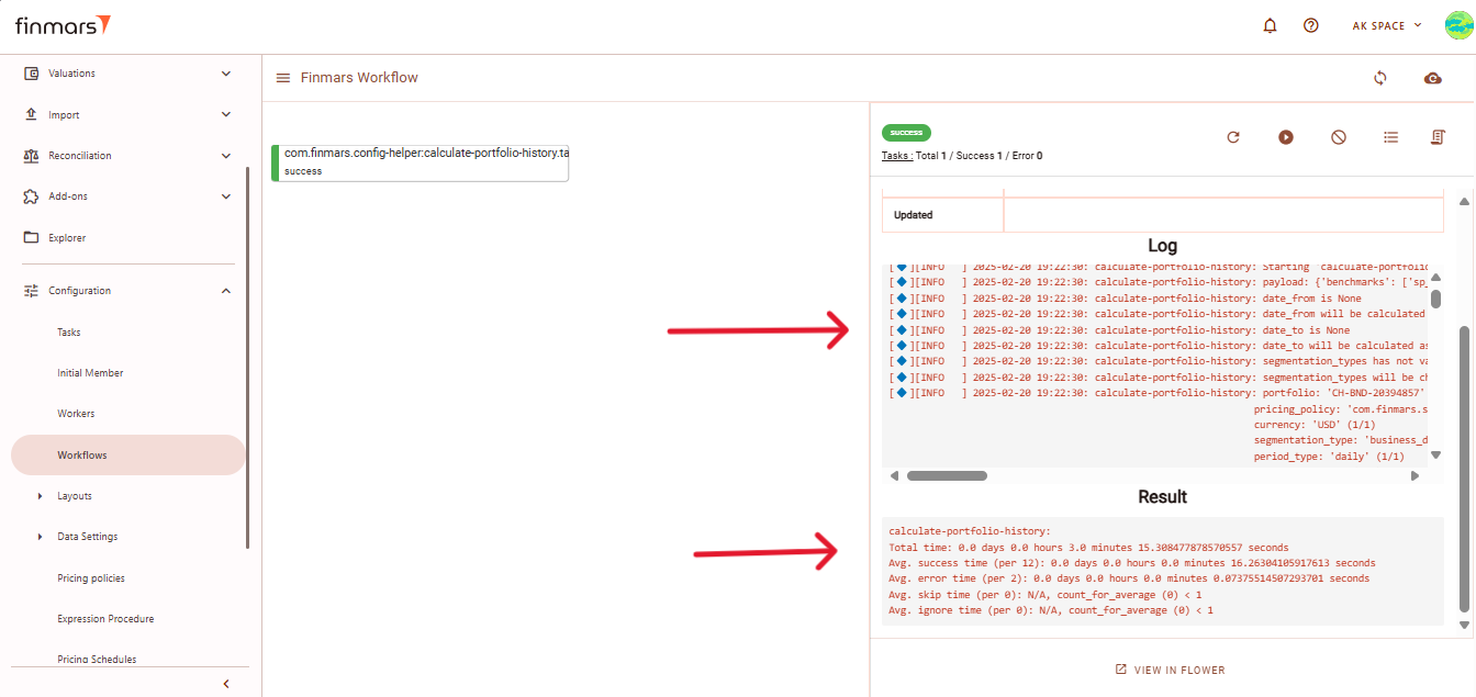 5. After starting the workflow, go to the Workflows section under Configuration to monitor the progress. The calculation will be displayed with Progress status. Once completed, it should show Success. If the results are not updated after running the workflow, refresh the page using the button in the top-right corner.