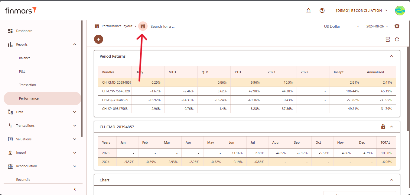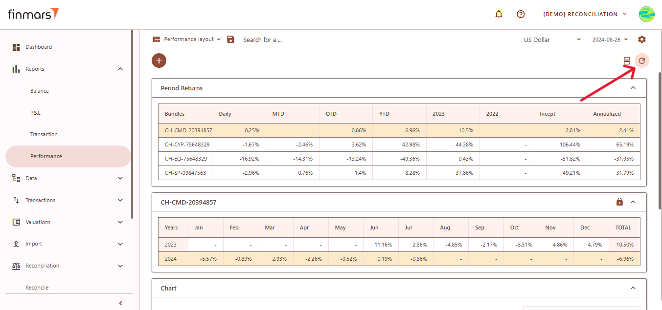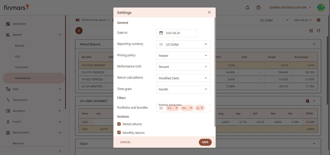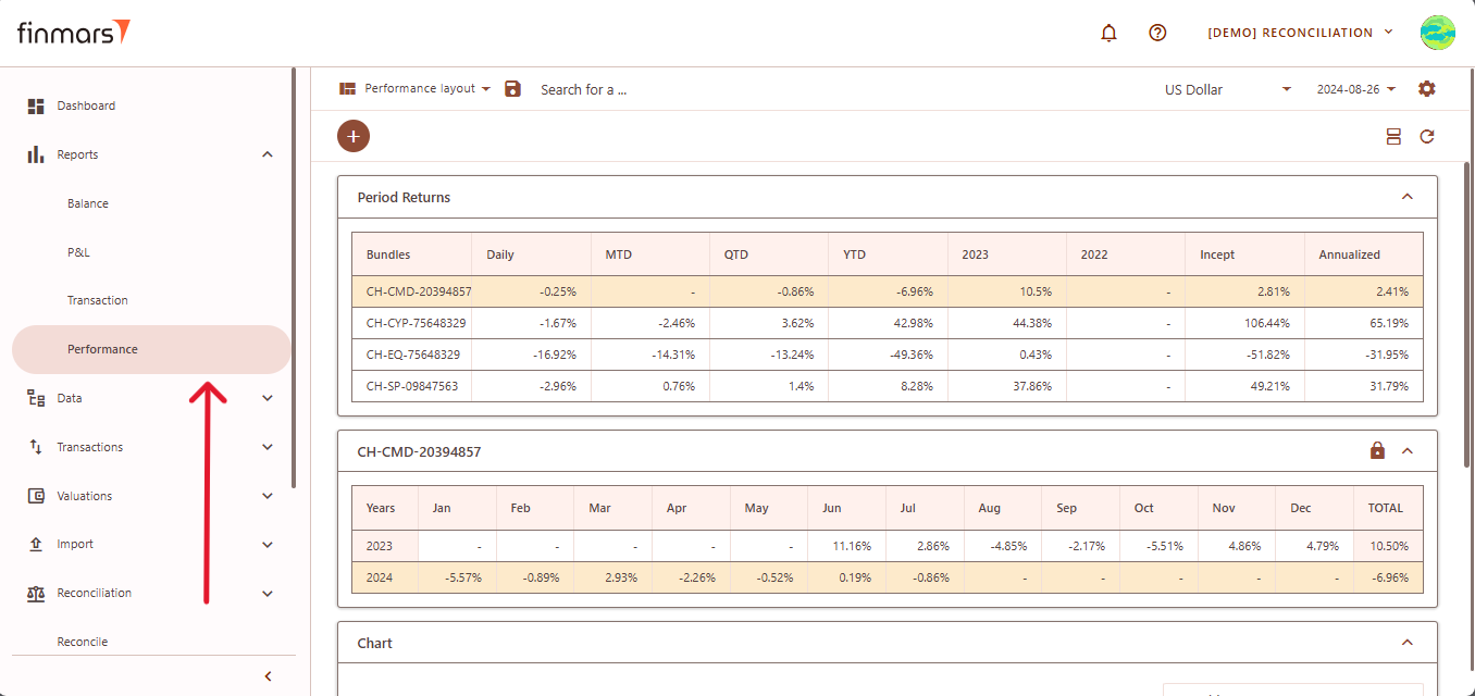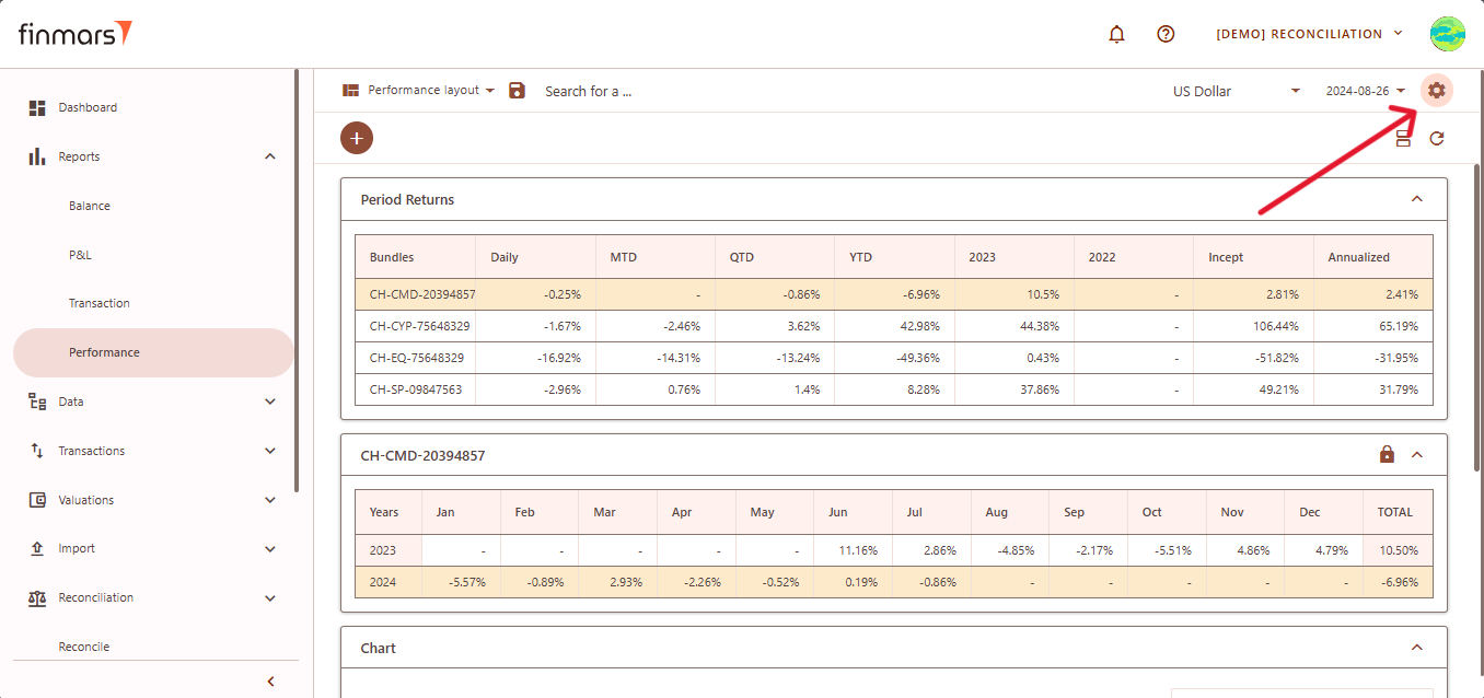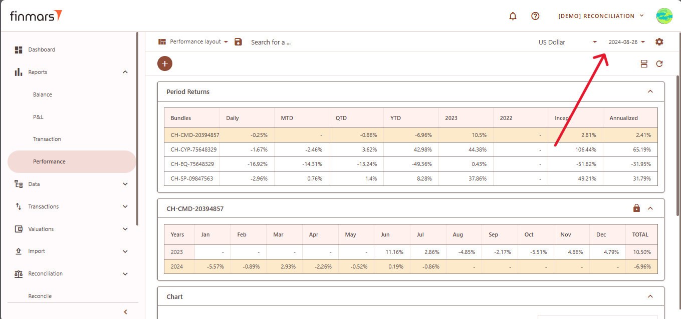 - Once on the Performance page, adjust the settings according to your reporting needs. Сonfirm the Currency in the top panel. Also, verify that the Report Date is set correctly. The system displays the balance as of the end of the selected day. This setting should always be used to reflect accurate financial data.