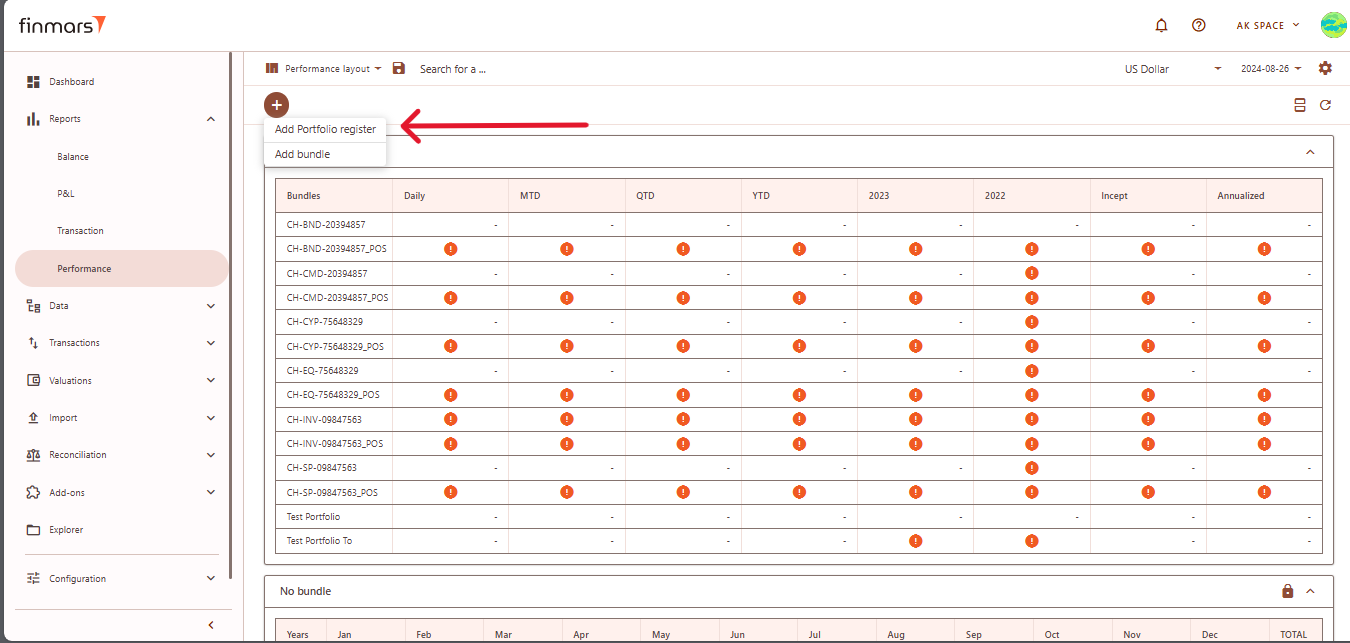 ////If the page does not update automatically after saving, you can refresh it manually using the refresh icon located in the top-right corner of the screen. - If you want to add additional data, click the "+" button at the top of the performance table and choose either Add Portfolio Register or Add