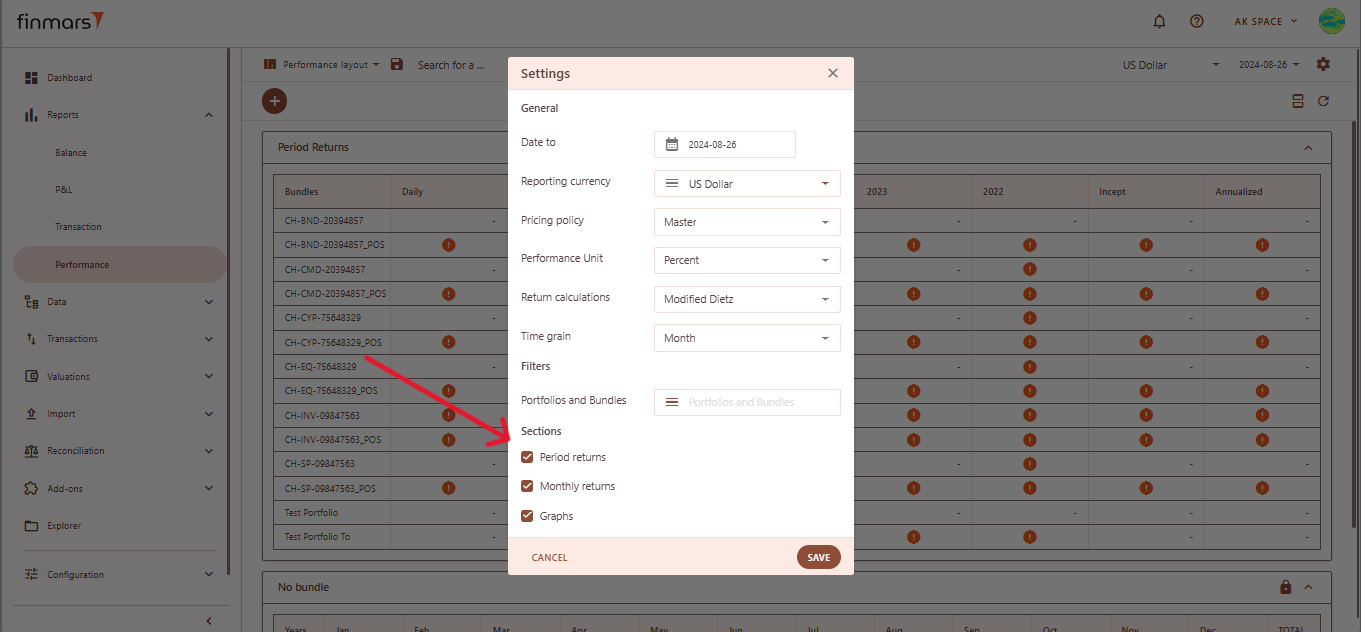 options///options. Modified Dietz is commonly used for performance reports, and for a detailed explanation of how this calculation works, refer to the How to Do Calculations for Performance (Modified Dietz) - . Set the time grain to define the period for performance calculations, such as daily or monthly. If you need to filter the report to specific portfolios or bundles, click on the Portfolios and Bundles field and select the relevant items.