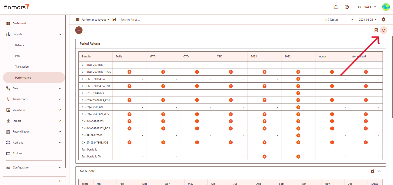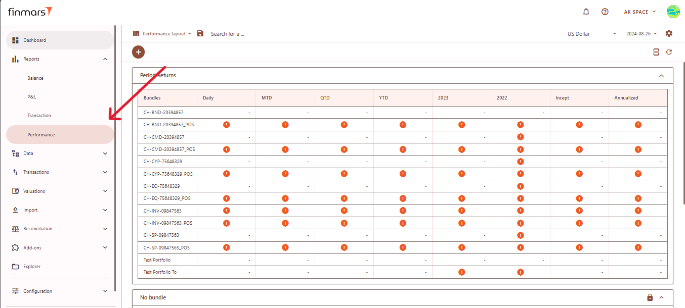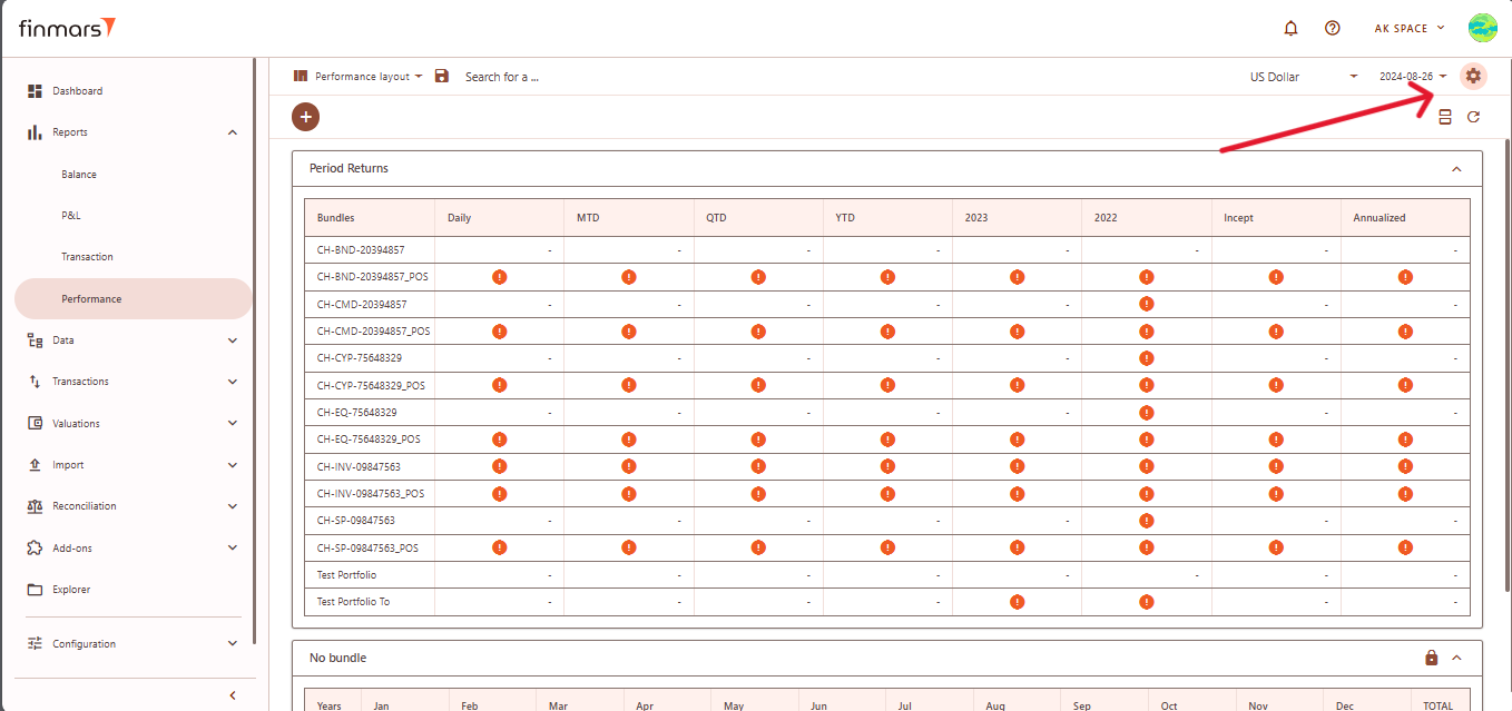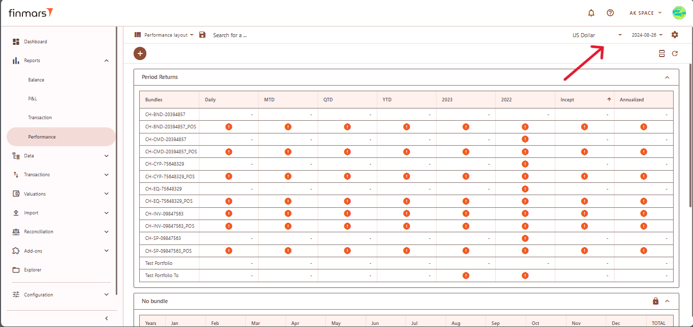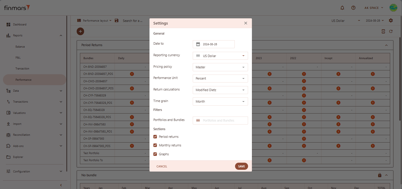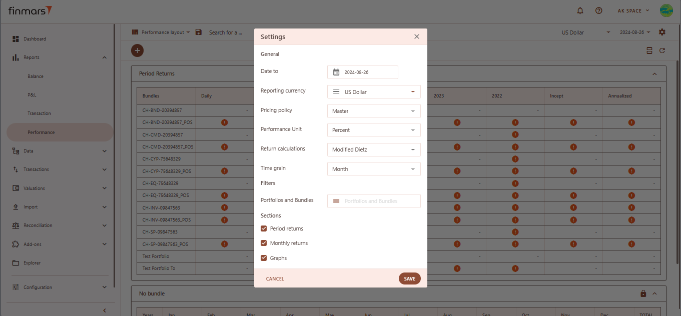 timeTime grain to define the period for performance calculations, such as daily or monthly. - If you need to filter the report to specific portfolios or bundles, click on the Portfolios and Bundles field and select the relevant items.