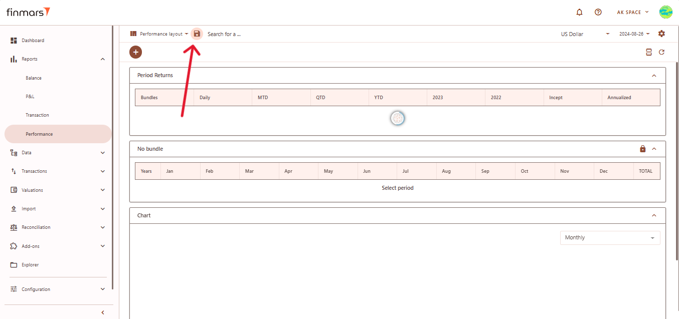 youonarethe Performance page, adjust the settings according to your reporting needs. Сonfirm the Currency in the top panel. Also, verify that thePerformanceReportReportDateinterface,is set correctly. The system displays the balance as of the end of the selected day. This setting should always be used to reflect accurate financial data. - If you want to configure more detailed report settings, click on the