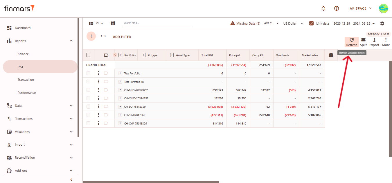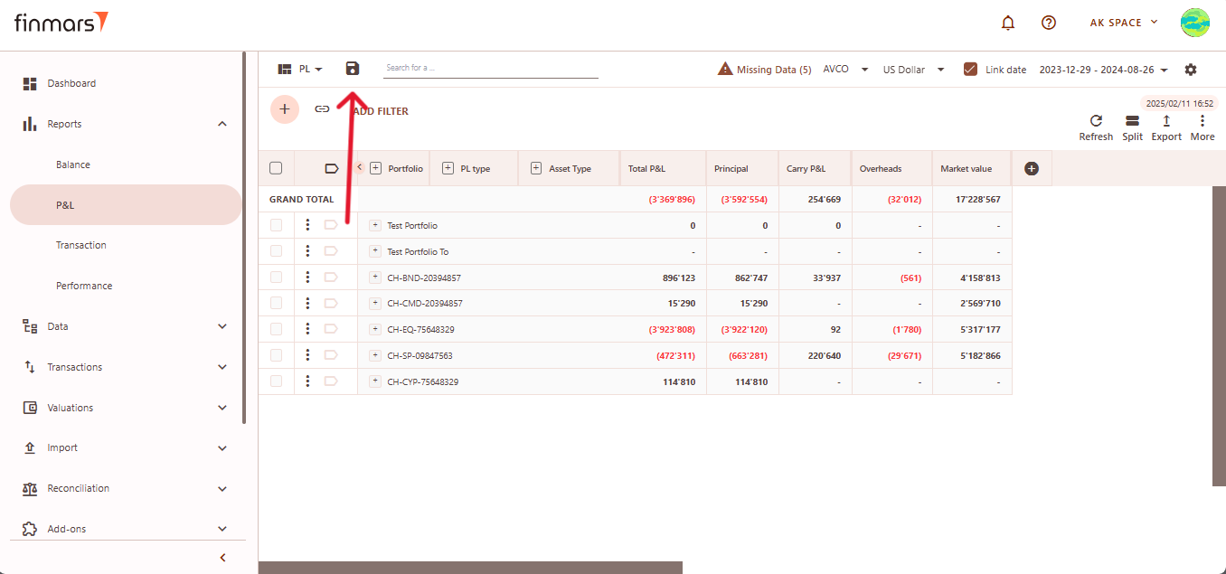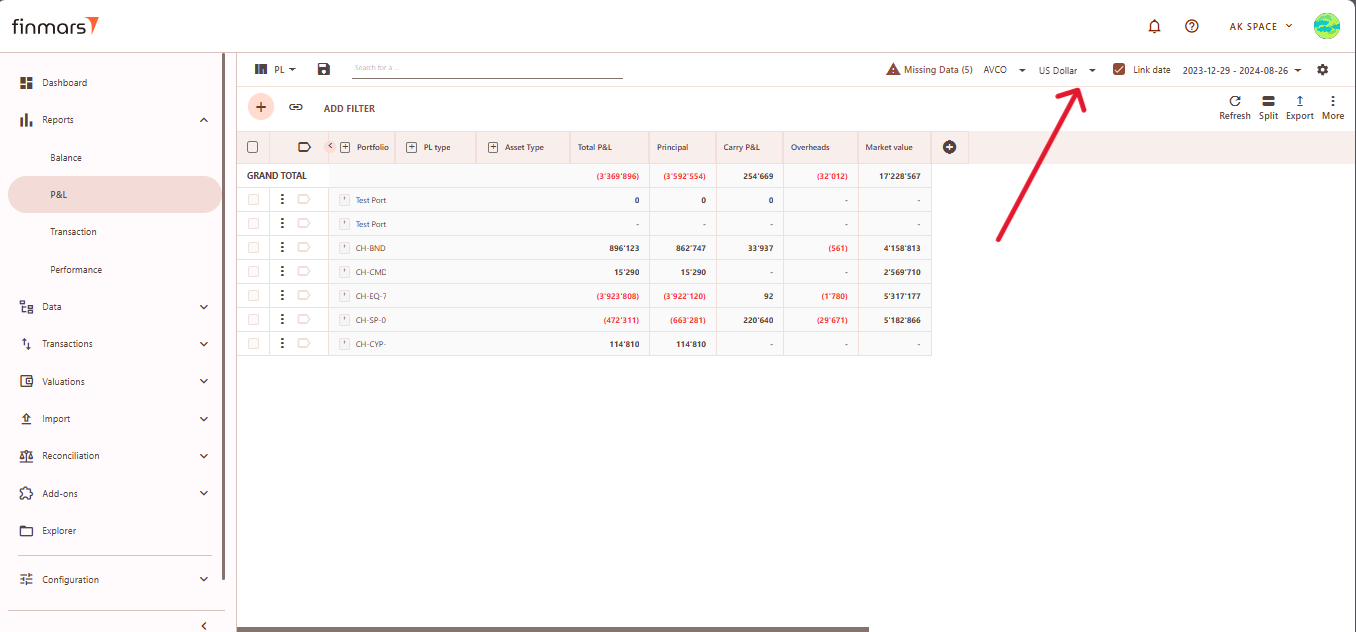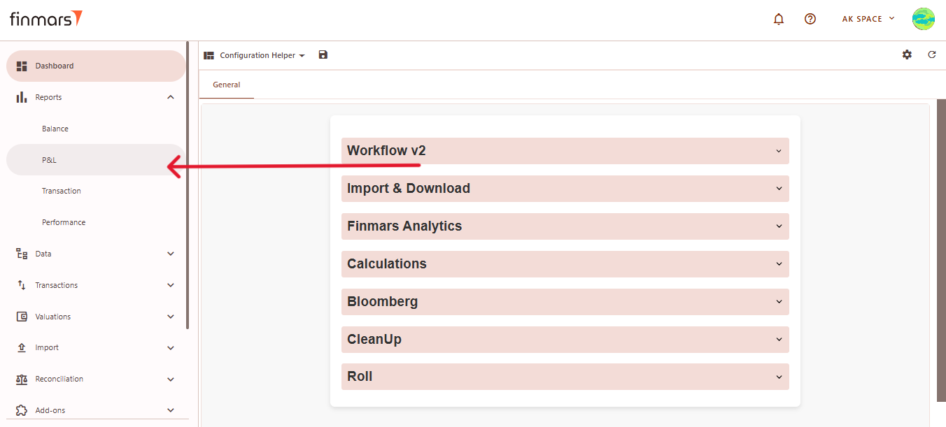 - Go to the left sidebar. Locate and select the Report section and click on P&L. Ensure that the correct layout is selected from the dropdown in the upper-left corner. If the wrong layout is selected, change it before proceeding.