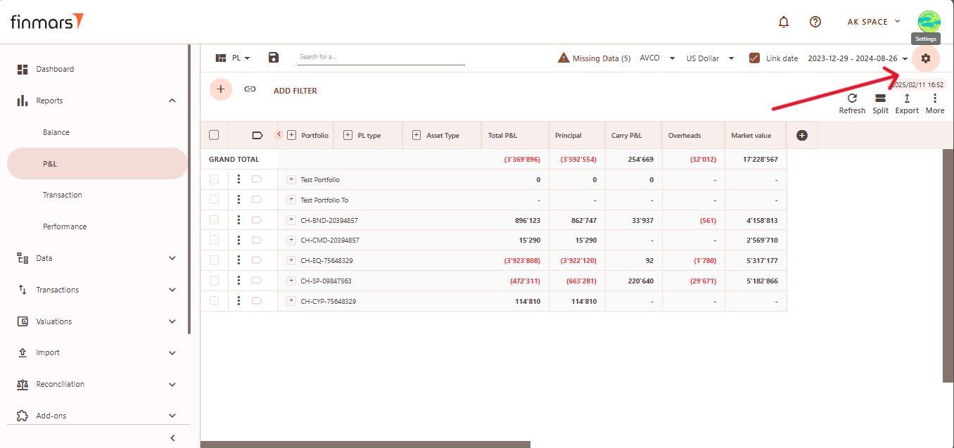 For example if you want to get P&L report for Week To Date you need to select Report Date: Previous Week End -> This Week End. It means that you need to select date range FROM the END of the PREVIOUS period to the END of the CURRENT period. - If you want to configure more detailed report settings, click on the gear icon in the top-right corner to open the settings panel.