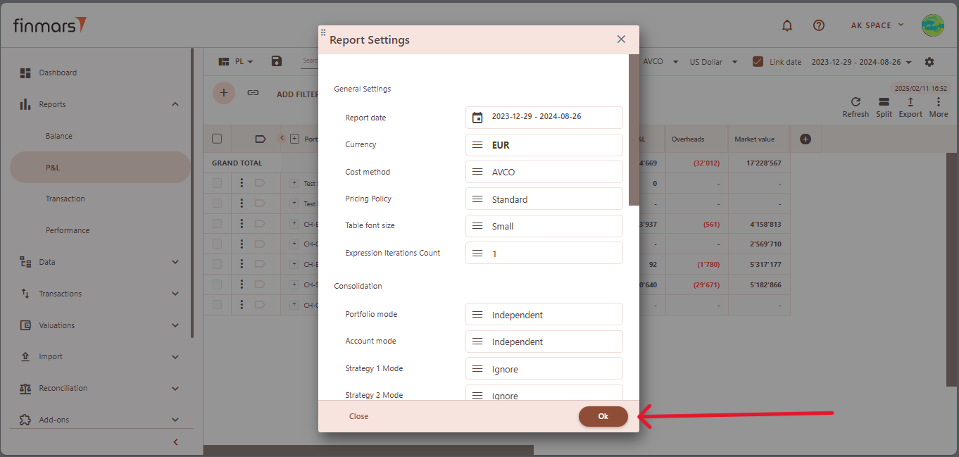 - Once on the P&L page, adjust the settings according to your reporting needs. Сonfirm the Calculation method, Pricing policy, and Currency in the top panel. Also, verify that the Report Date is set correctly.