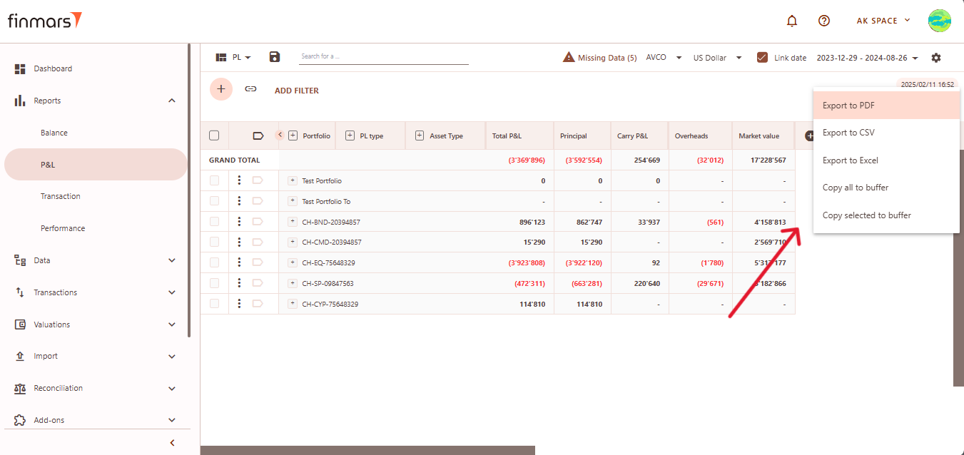 - The Export option is located in the top-right corner, providing multiple formats for downloading the report. You can choose to Export to PDF, Export to CSV, or Export to Excel, depending on the preferred format for further analysis. Additionally, there are options to Copy all to buffer or Copy selected to buffer, allowing you to quickly copy report data for use in other applications. Ensure that the exported or copied data accurately reflects the report before using it for financial reporting or analysis.