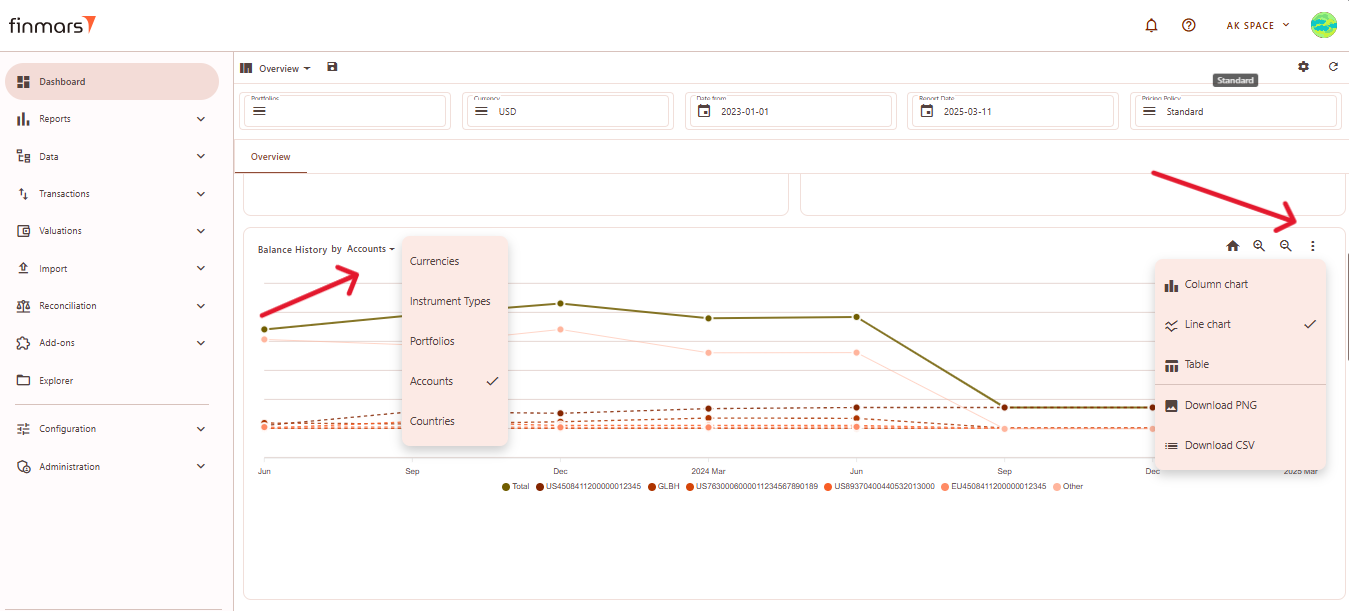 • Balance History by Accounts – This section visualizes the historical changes in asset balances over time. The chart helps track trends in portfolio values, showing fluctuations across different accounts.