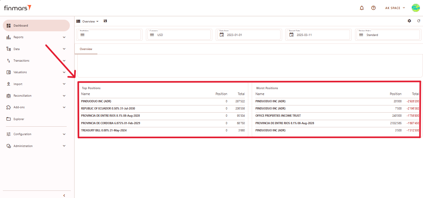 • Worst Positions – Displays the weakest-performing assets, highlighting losses.