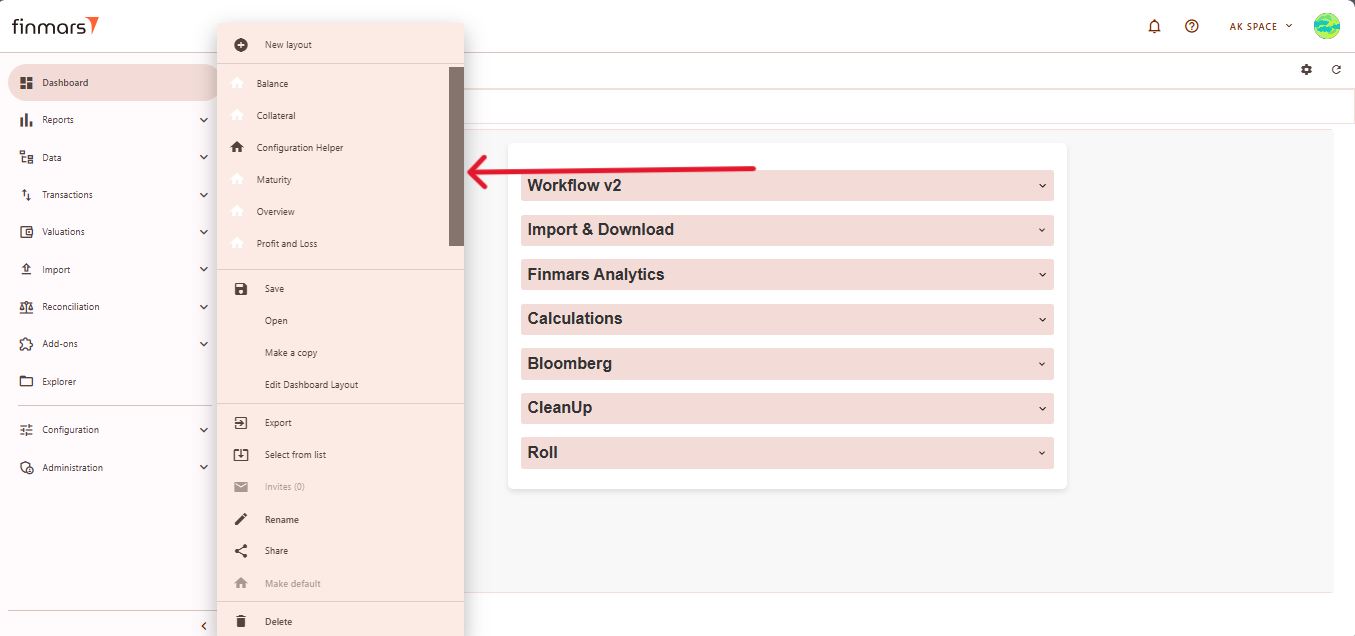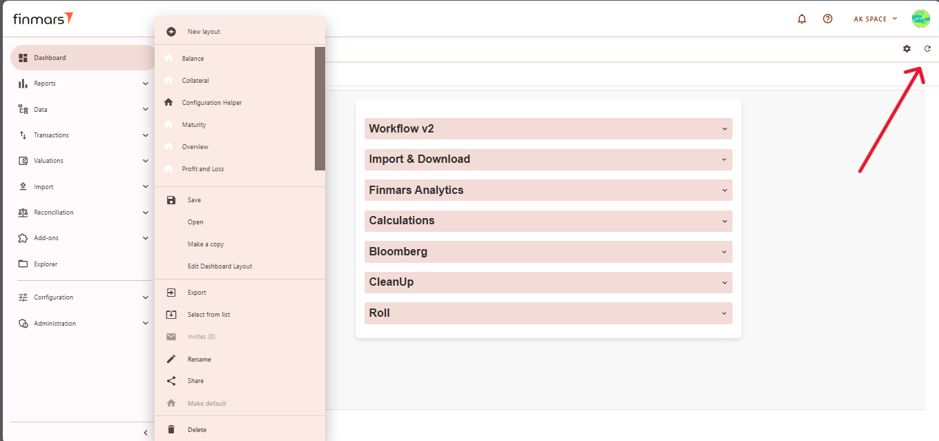 ***Go to the Dashboard tab in the left-side menu.***At the top of the page (next to the save icon), you will see the current dashboard layout name. Click on this name to open the dropdown menu listing all available layouts.***From this dropdown, select the standard dashboard you want to check (e.g., Balance, Profit and Loss, Configuration Helper, STD Manual Import, etc.). Standard dashboards are indicated clearly without custom naming.- At the bottom of the dashboard, several icons provide additional functionality: