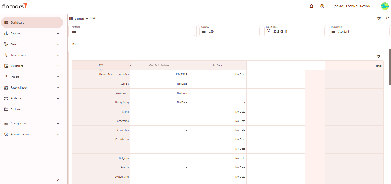 The Balance Sheet (BS) layout provides an overview of asset distribution by different categories, such as countries, accounts, or asset types.